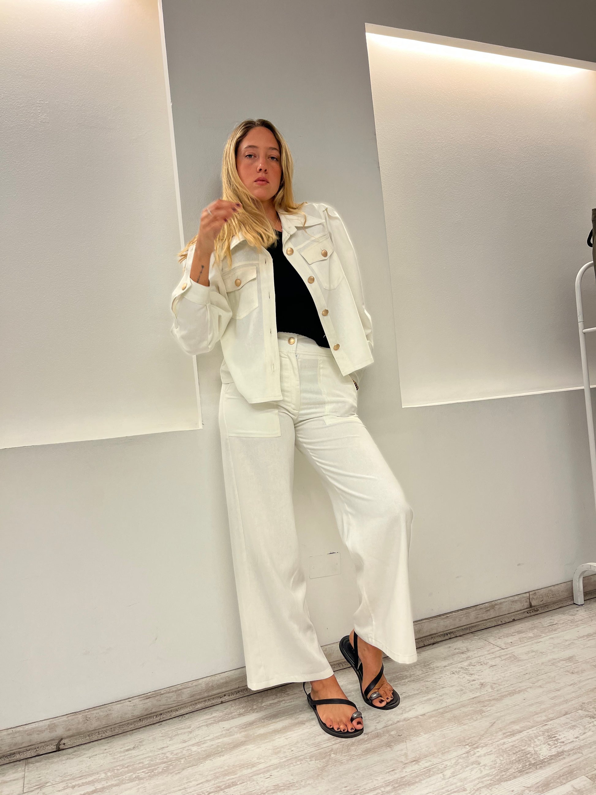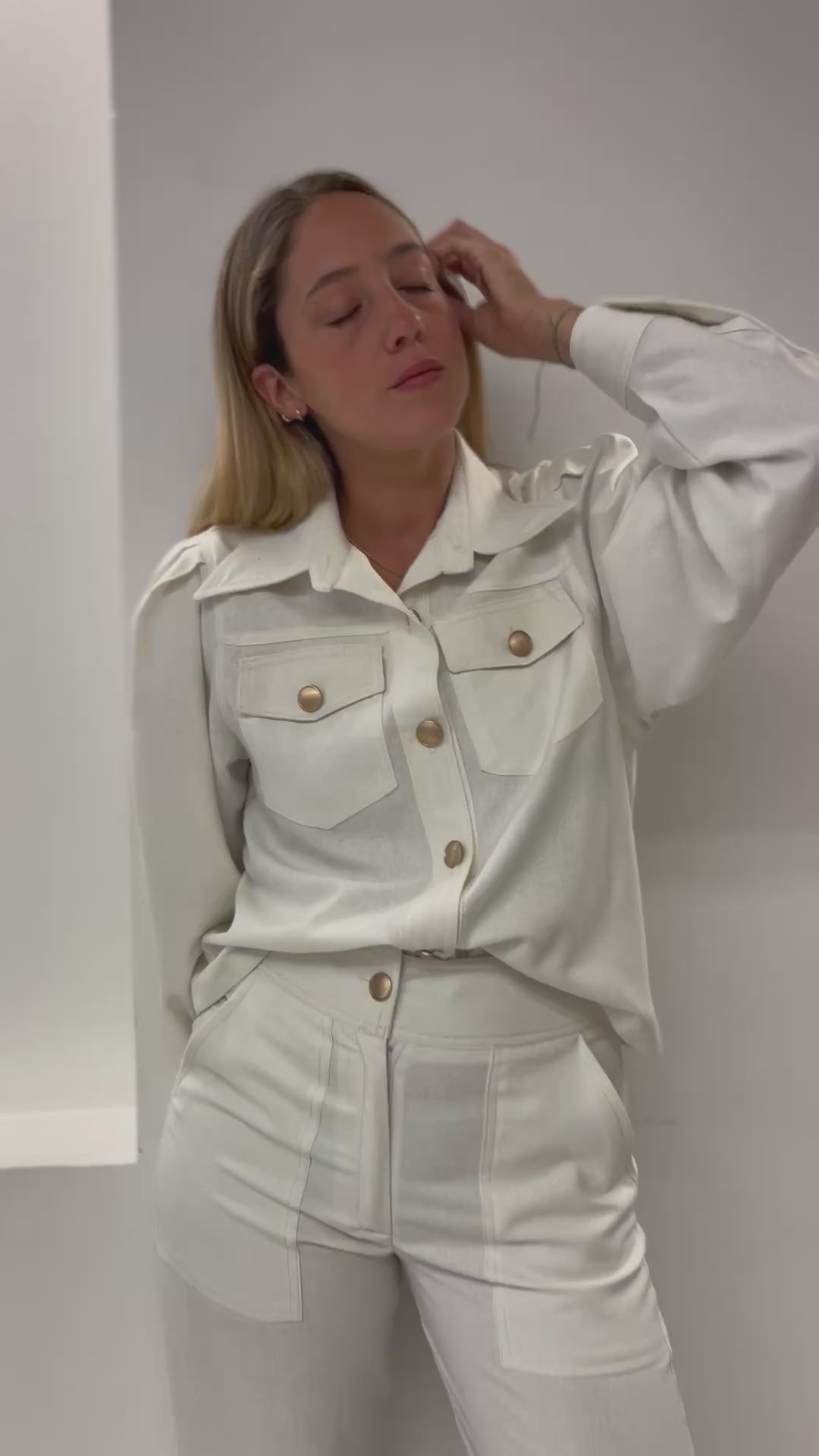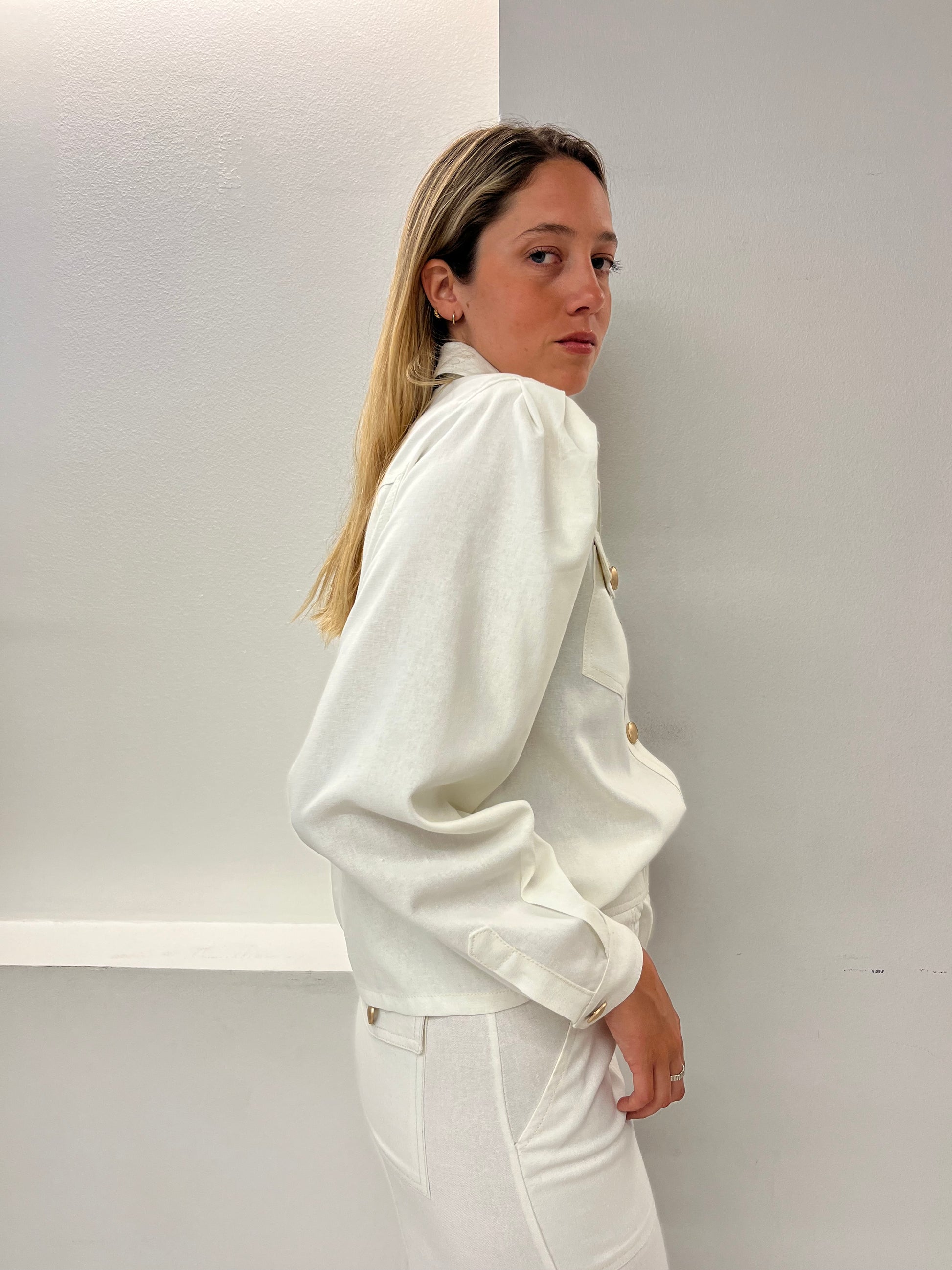 La Blusa Jacket Lazio se puede usar tanto como Blusa , como Jacket , está hecha en Lino Viscosa . Su diseño camisero con bolsillos cargo y mangas aglobadas le dan un toque actual y romántico , sus botones bronce dorados luz y modernidad