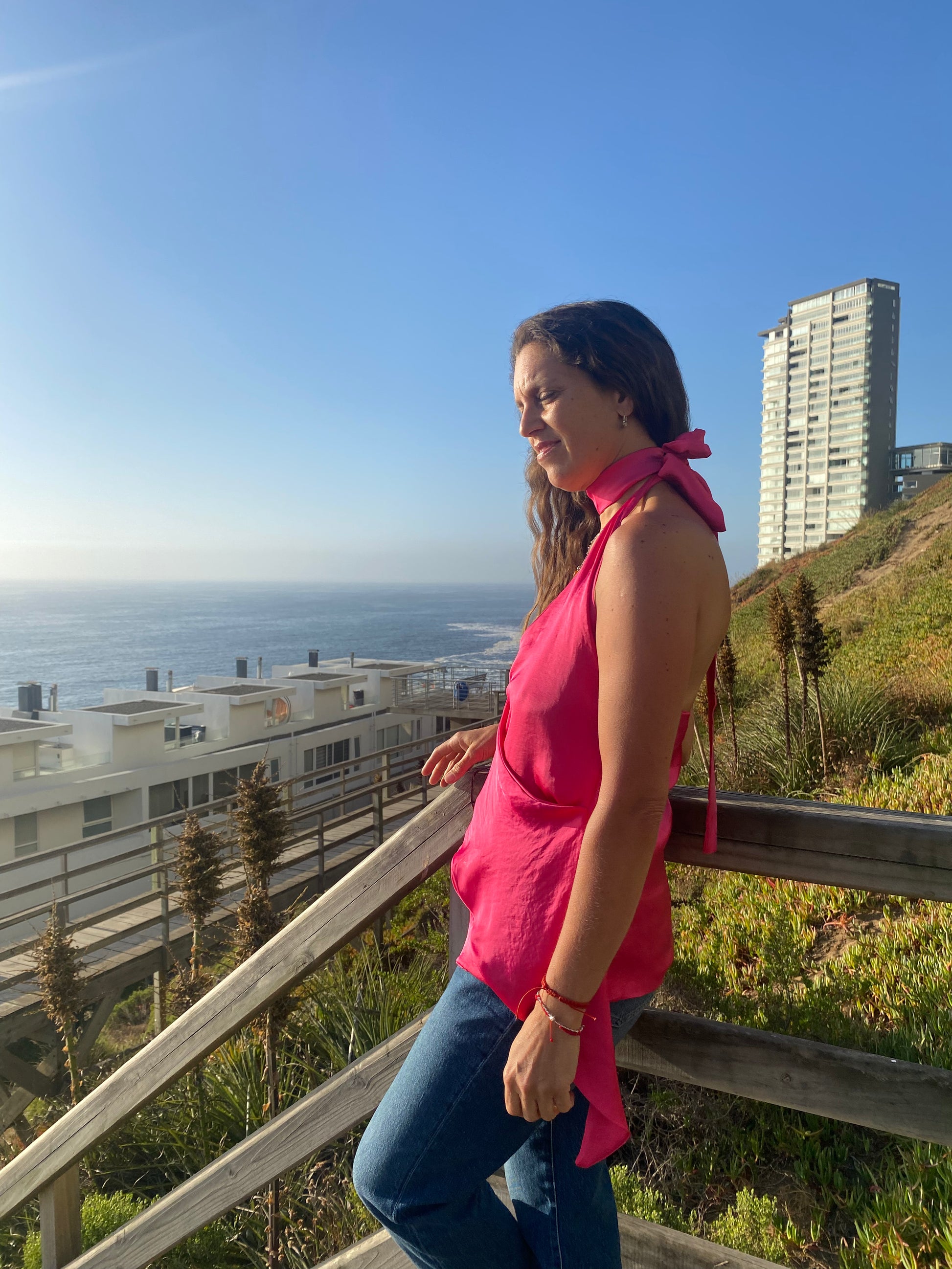 El top Verona de Satin , confeccionado totalmente doble para dar contextura y caída , es un diseño muy versátil de la nueva Colección GLAM para usarlo tanto de día y de noche en tus momentos especiales . Diseñado con un cruce y caída tipo pañuelo al costado con un lazo para amarrar en el cuello .